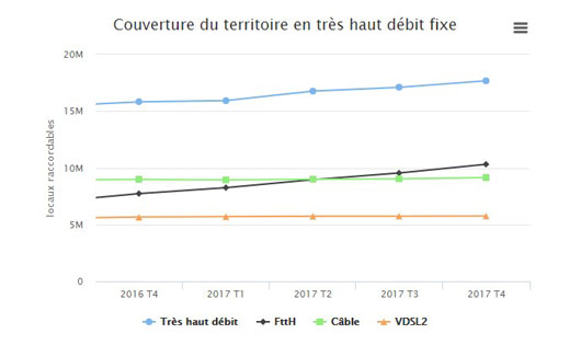 L'observatoire de l'ARCEP du dernier trimestre 2017 affiche de nouveau une progression des déploiements des réseaux FTTH, marquée par rapport à l'année précédente. En effet, plus de 751 000 lignes supplémentaires ont été mises en place sur le dernier trimestre de 2017 ; ce qui correspond à la valeur trimestrielle la plus élevée selon l'ARCEP.